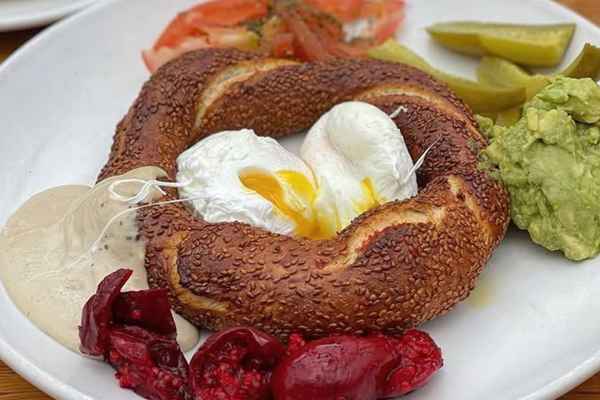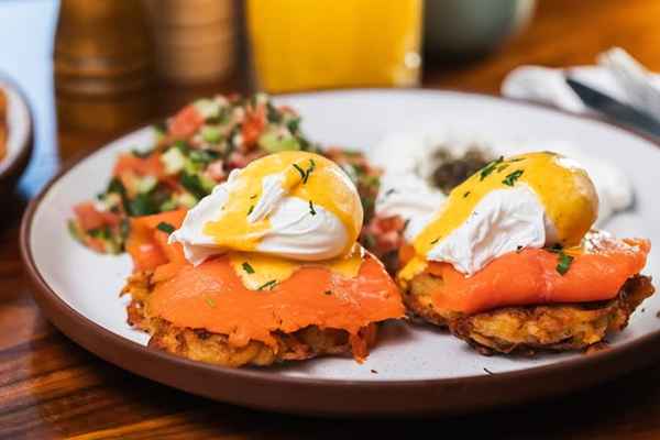 Poached eggs, smoked salmon, harissa-hollandaise, zaatar-labneh, and chopped salad.