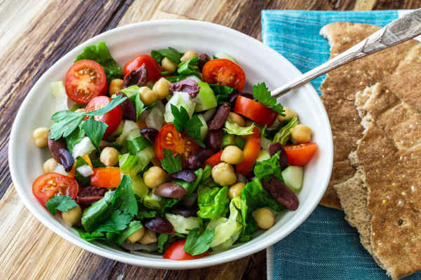 Fresh salad of assorted lettuces, radicchio, cucumber, tomato, green onions with corn, and chickpeas.